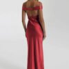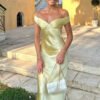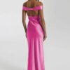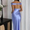 An off-shoulder satin prom dress with a mermaid silhouette, designed for refined evening occasions.
